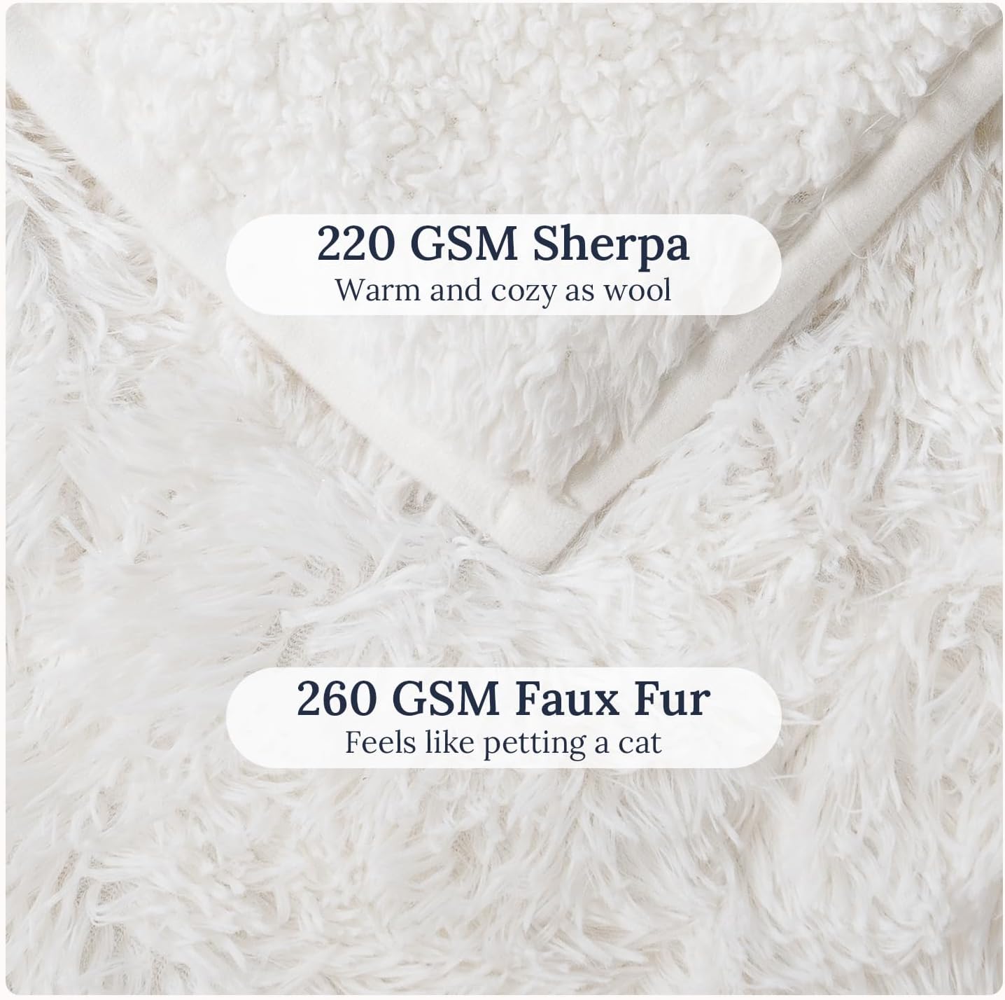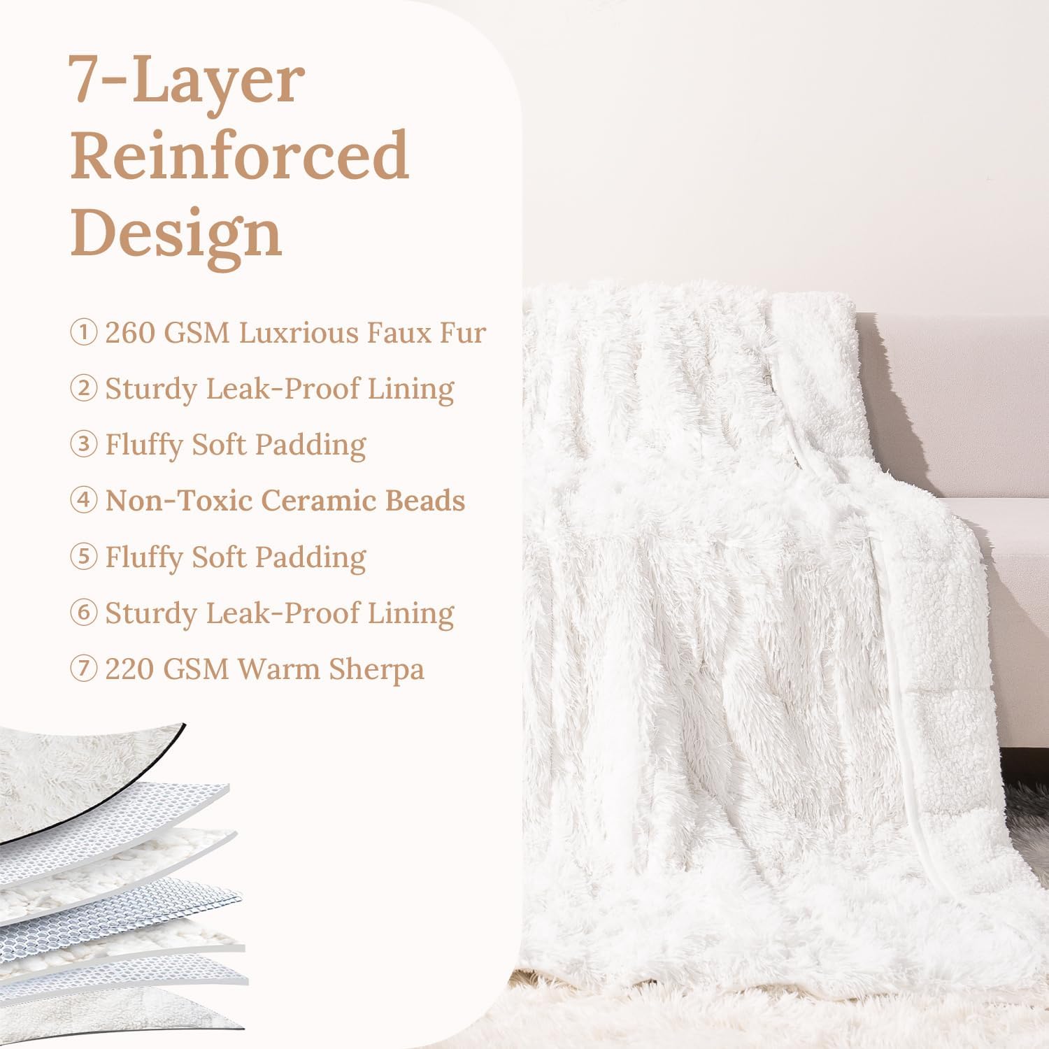 This faux fur weighted blanket features 260 GSM, 1.6-inch faux fur PV fleece on one side, and 220 GSM Sherpa on the other for cloud-like softness. Together, they create a harmony of style and comfort, making every moment with this blanket a heavenly experience.7 layers construction.